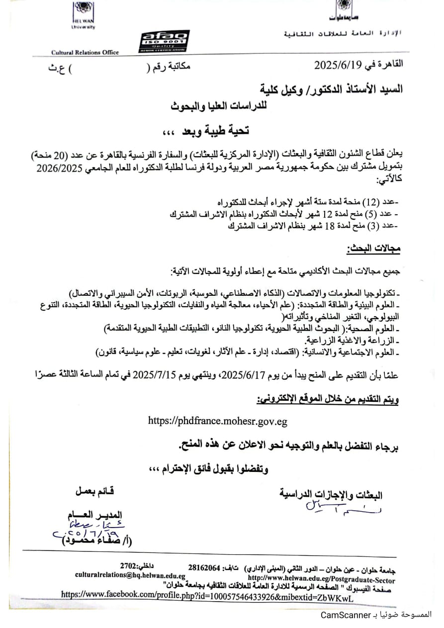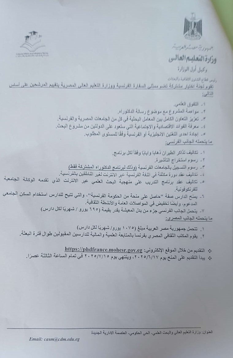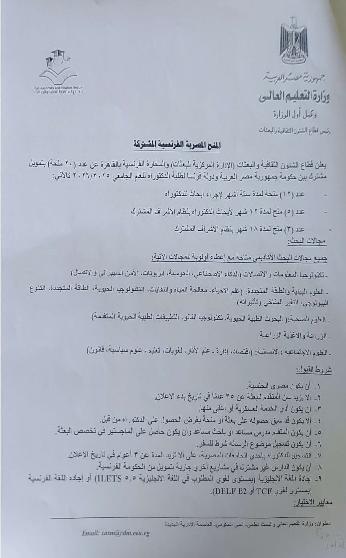 يعلن قطاع الشئون الثقافية والبعثات (الإدارة المركزية للبعثات) والسفارة الفرنسية بالقاهرة عن عدد (20 منحة) بتمويل مشترك بين حكومة جمهورية مصر العربية ودولة فرنسا لطلبة الدكتوراه للعام الجامعي 2025/2026 كالآتي: